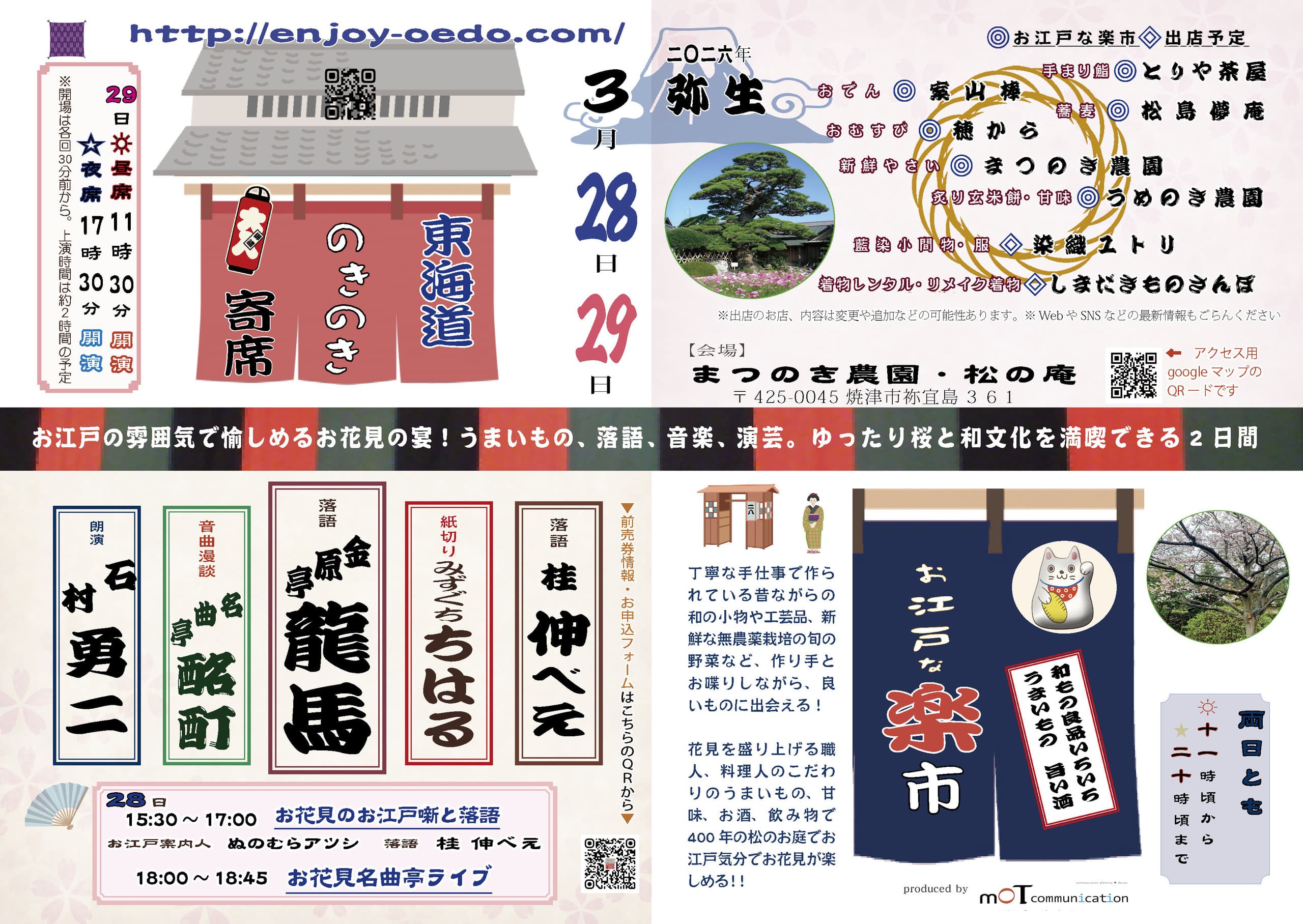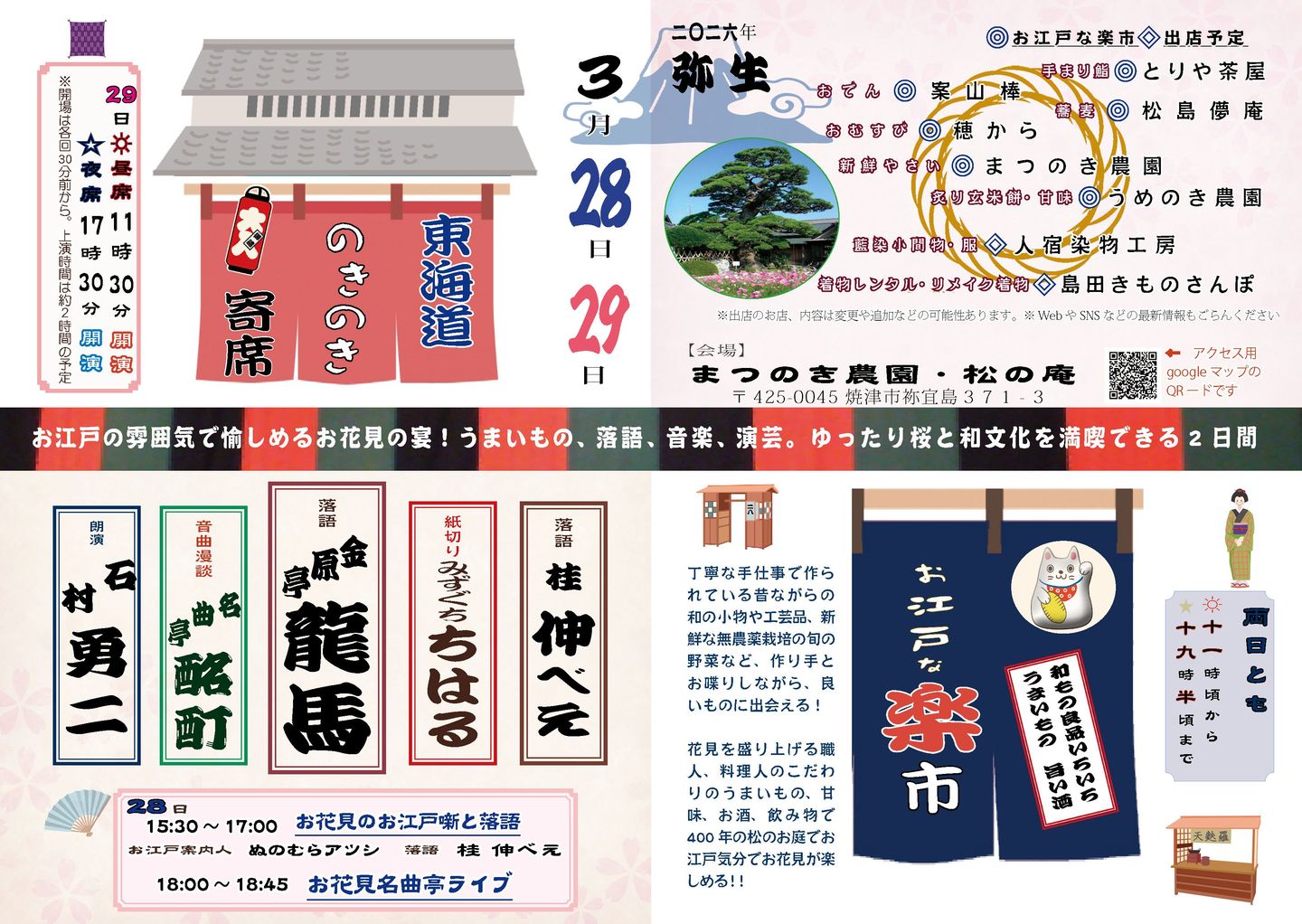 | 1日目は江戸の暮らし文化を面白がる「お江戸噺と落語」と夕方からは花見を盛り上げる名曲亭ライブがございます。 |